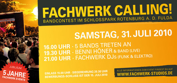 Fachwerk-Studios und VHHG präsentieren den „Fachwerk Calling! BANDCONTEST im Schlosspark“ am 31. Juli 2010 in Rotenburg an der Fulda. Hier könnt Ihr der ganzen Gegend zeigen, was in Euch steckt. Die fünf hoffnungsvollsten Bands der Region treten gegeneinander an und wollen alle nur eins: Rotenburg für ein paar Stunden die bürgerliche Kurortsmüdigkeit austreiben und das Publikum in Hochsommer-Extase rocken.