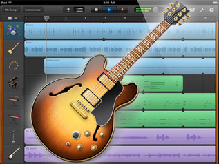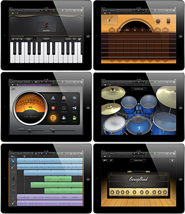 Aber es geht nicht direkt um das neue iPad. Apple hat parallel zur iPad-Veröffentlichung auch die neue Version von GarageBand aus der iLife-Palette veröffentlicht. Wer GarageBand nicht kennt: GarageBand ist eine Art „Very Lite“-Version von Logic und wurde einst für den Mac konzipiert . Doch mittlerweile gibt es dieses nette App auch für iPad und iPhone. Man kann mit GarageBand einfach und schnell Spuren aufnehmen und mit Sampler-basierten Instrumenten das Ganze aufpeppen. Es gibt 80 verschiedene Keyboards, 6 Drumkits, 4 Gitarren und 4 Bässe. Und wer ganz mutig ist, der kann auch dazu singen.
