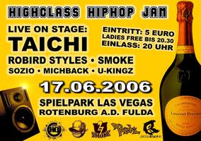 Die Highclass HipHop Jam im Spielpark Las Vegas in Rotenburg a.d. Fulda steht vor der Tür. Freut euch auf eine Jam der Extraklasse mit Topacts, wie Taichi von Krasscore Records, sowie Robird Styles, der bei Jubeko jetzt sein neues Album 'Charterflug' veröffentlicht und Smoke (auch bei Jubeko Records).