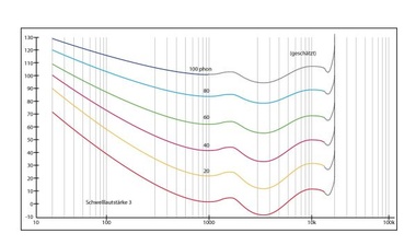 Die Kurven gleicher Lautstärke zeigen die Frequenzabhängigkeit der Lautstärkewahrnehmung